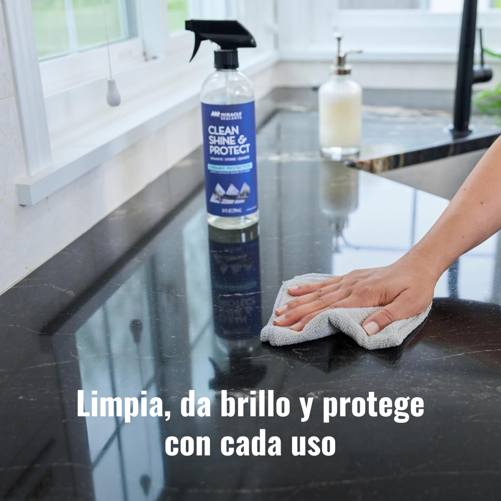 Miracle Sealants Clean Shine & Protect limpia, pule y protege con cada aplicación. Clean Shine & Protect contiene Protección Cerámica que se adhiere a las superficies de piedra y ayuda a repeler derrames y suciedad, facilitando la limpieza.